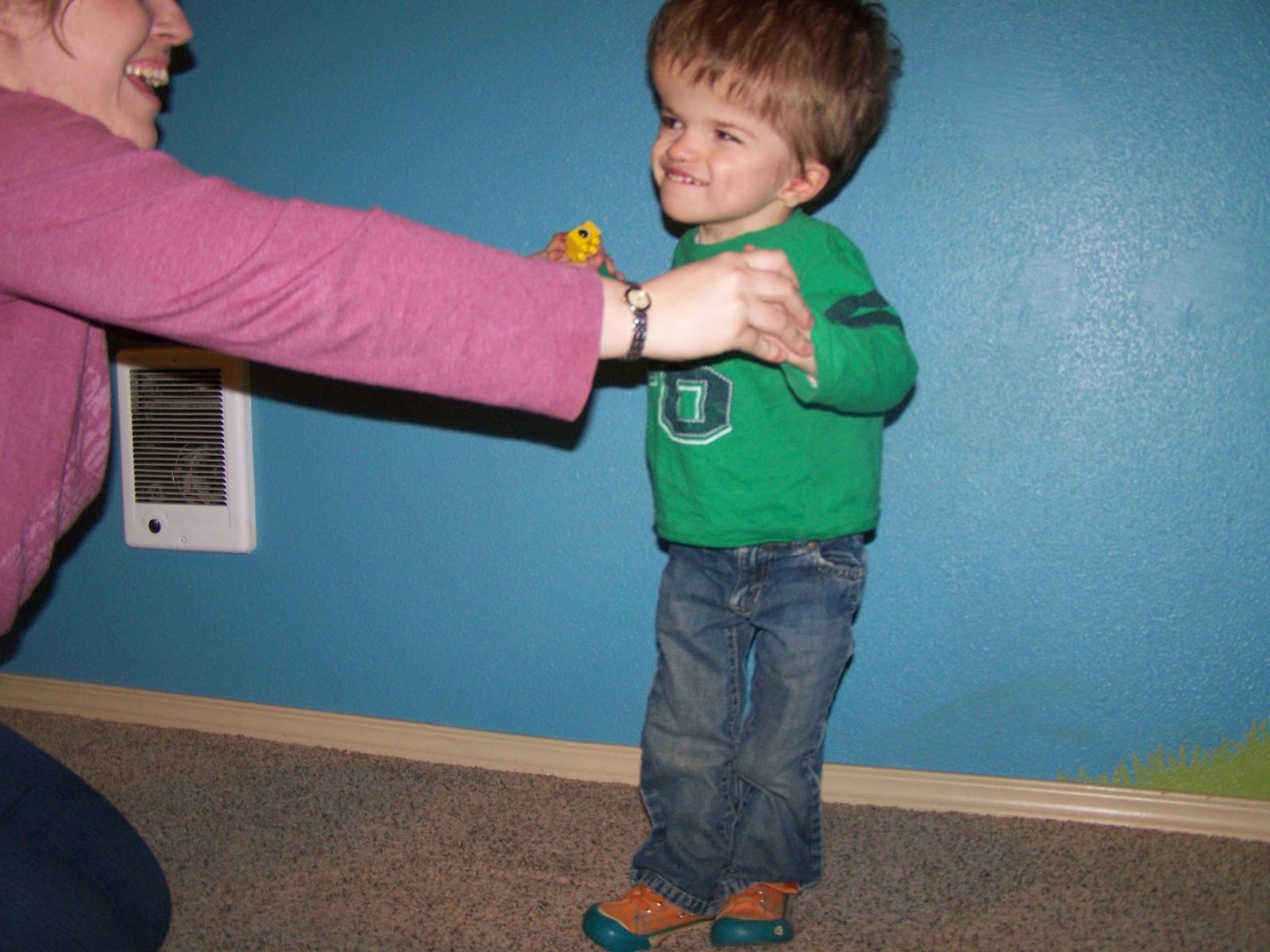 And then a couple of weeks ago, he started pulling at my hands, like he wanted to stand. He has never done this before, and he has never been strong enough to support himself like this before. Before it was always me trying to convince him to allow me to prop him into a standing position for a few moments at a time. And all of a sudden he decided he was going to do this. Stand up, just holding onto my hands for balance. I can feel his new strength. Before he felt floppy, a bit like a noodle most of the time, with a weak core. Suddenly now his core is strong and his legs are still ridiculously thin, but stronger than before. I am guessing that with his hips and legs now healed and strong, he has realized that it no longer hurts to bear weight. I'm not sure what made the sudden difference, or where his sudden surge in confidence came from, but I am so excited for him! He really wants to do this! Over and over again, all day, every day. The boy wants to get up and move!